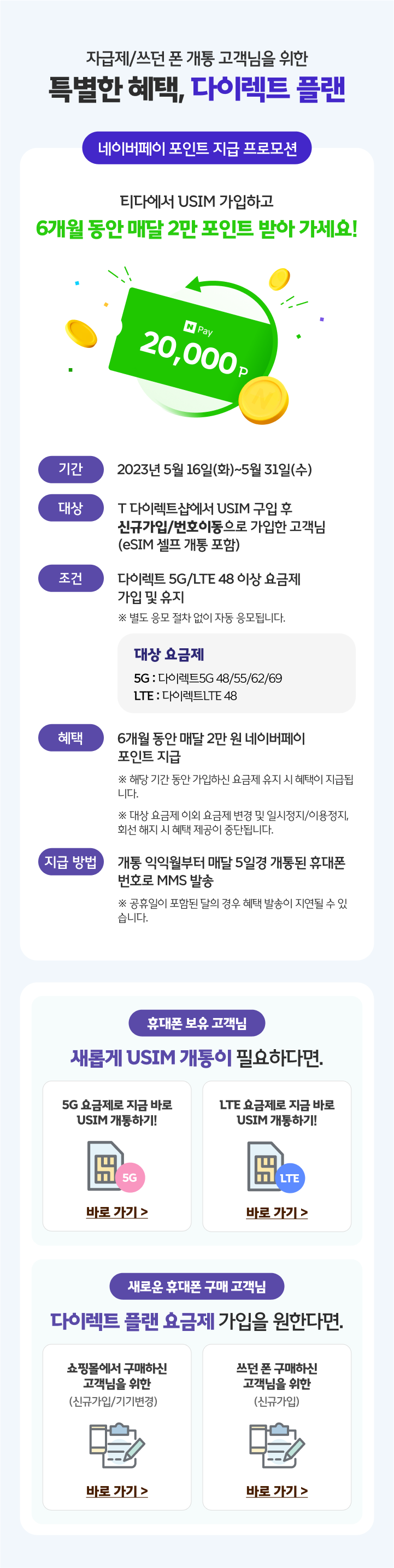 티다에서 USIM 단독 가입하고 6개월 동안 매달 2만 포인트 받아 가세요!