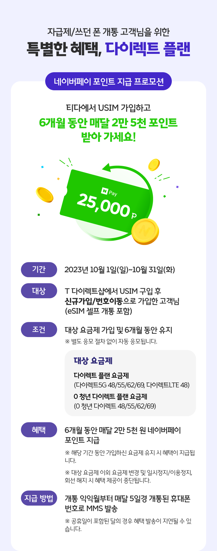 티다에서 USIM 단독 가입하고 6개월 동안 매달 2만 5천 포인트 받아 가세요!