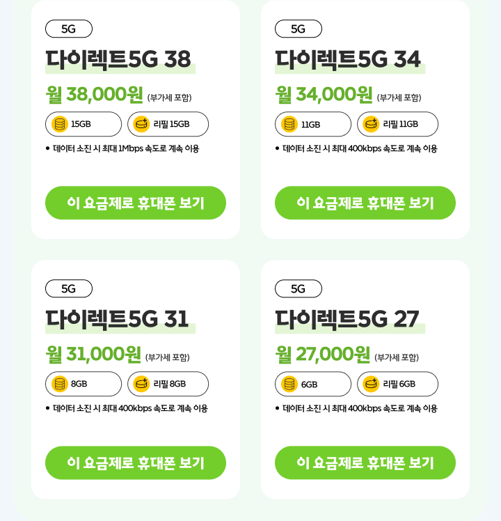 • [5G] 다이렉트5G 27 | 월 27,000원(부가세 포함) | 6GB | 리필 68GB | 데이터 소진 시 최대 400kbps 속도로 계속 이용