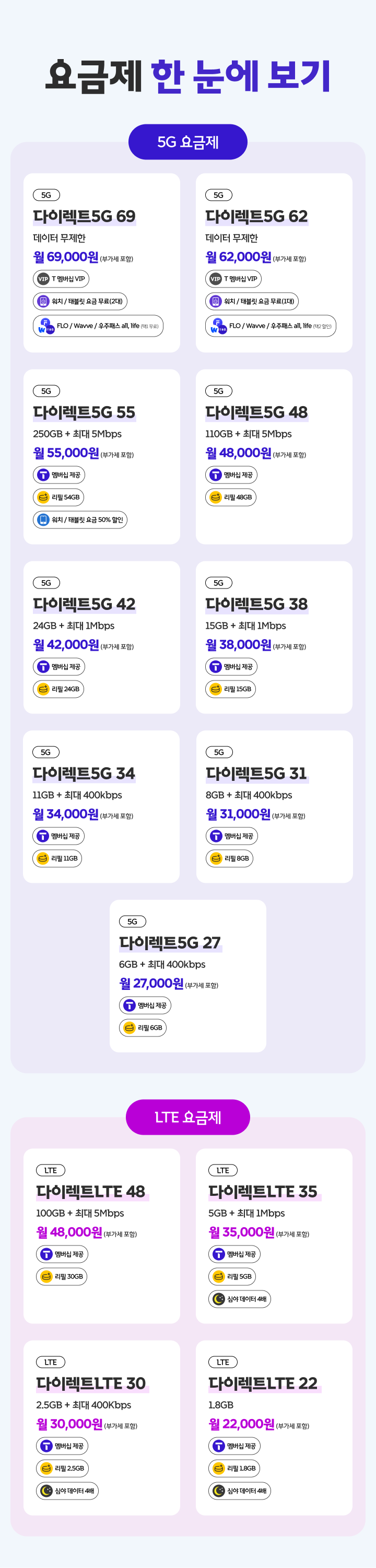 • [5G] 다이렉트5G 69 | 월 69,000원(부가세 포함) | 완전무제한 | T 멤버십 VIP | FLO/Wavve/우주패스 all/우주패스 life(택1 무료)