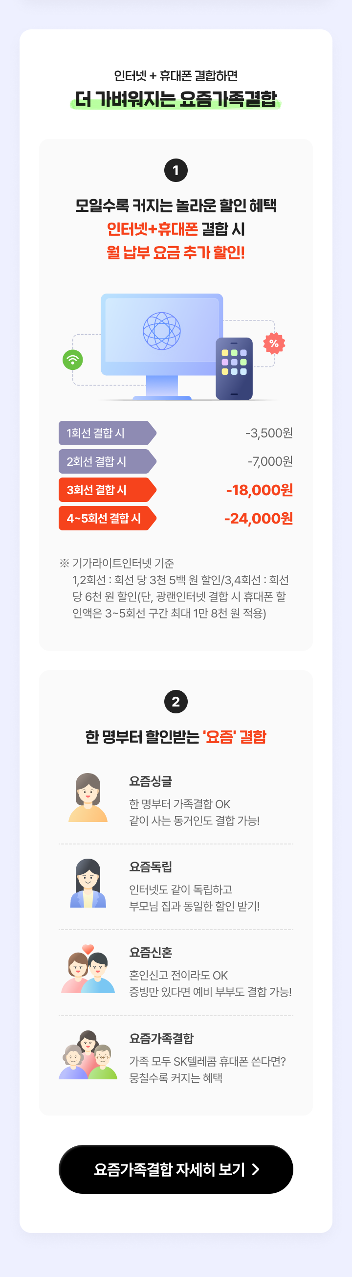 ※ 기가라이트인터넷 기준 1,2회선 : 회선 당 3천 5백 원 할인/3,4회선 : 회선 당 6천 원 할인 단, 광랜인터넷 결합 시 휴대폰 할인액은 3~5회선 구간 최대 1만 8천 원 적용