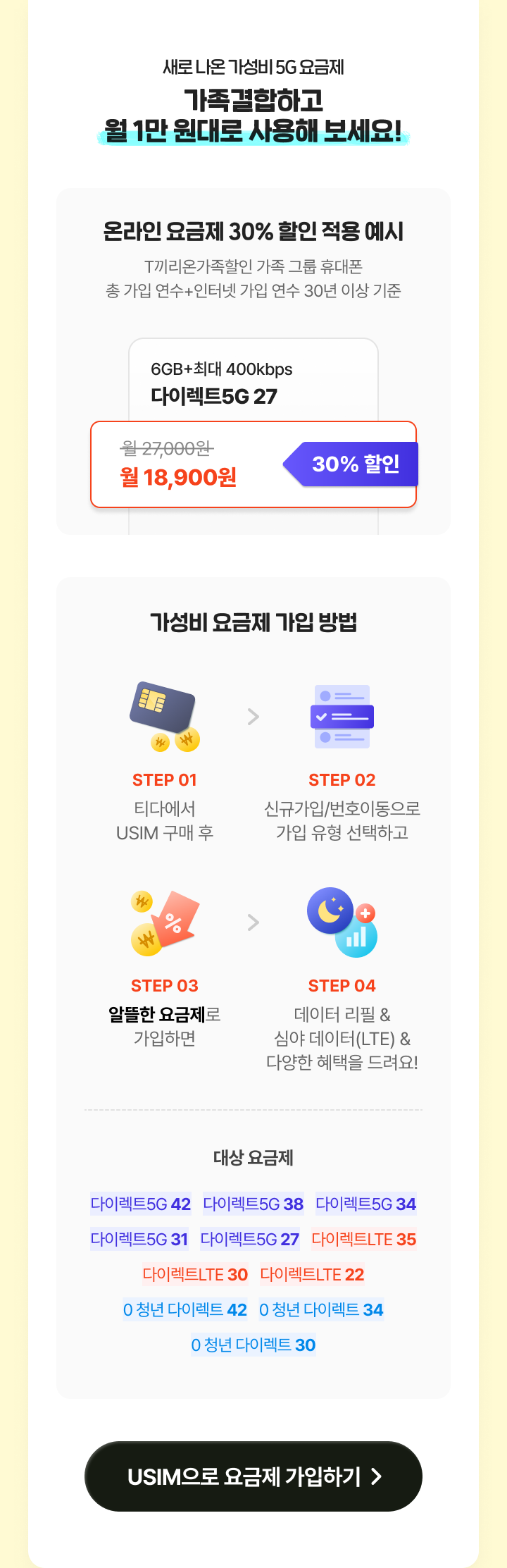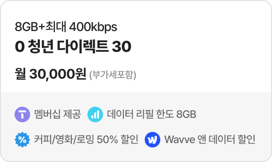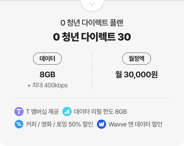 온라인 요금제 30% 할인 적용 예시(T끼리온가족할인 가족 그룹 휴대폰 총 가입 연수+인터넷 가입 연수 30년 이상 기준) 6GB+최대 400kbps | 다이렉트5G 27 | 월정액 월 27,000원 혜택가 월 18,900원 [30% 할인]