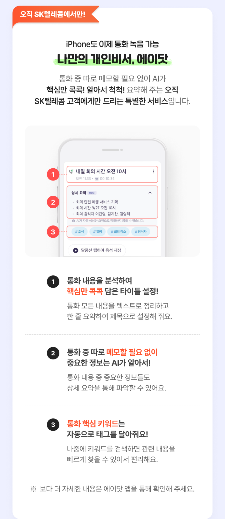 통화 중 따로 메모할 필요 없이 AI가 핵심만 콕콕! 알아서 척척! 요약해 주는 오직 SK텔레콤 고객에게만 드리는 특별한 서비스입니다.