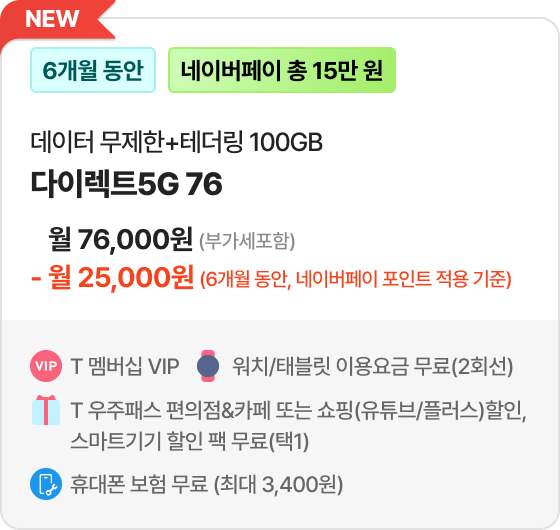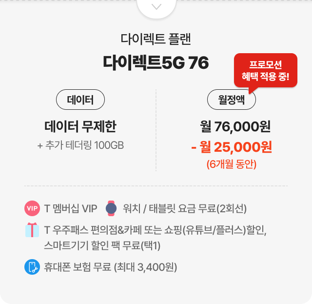 다이렉트5G 76 가입하고 스마트기기 할인 팩 선택하면 최대 100% 할인