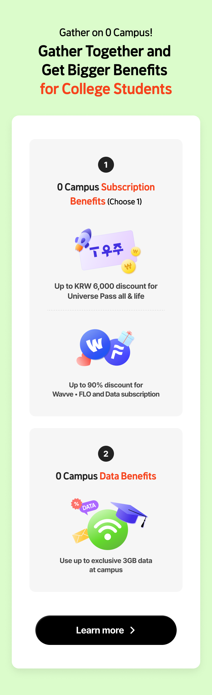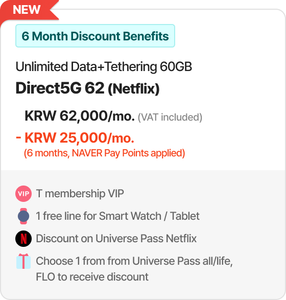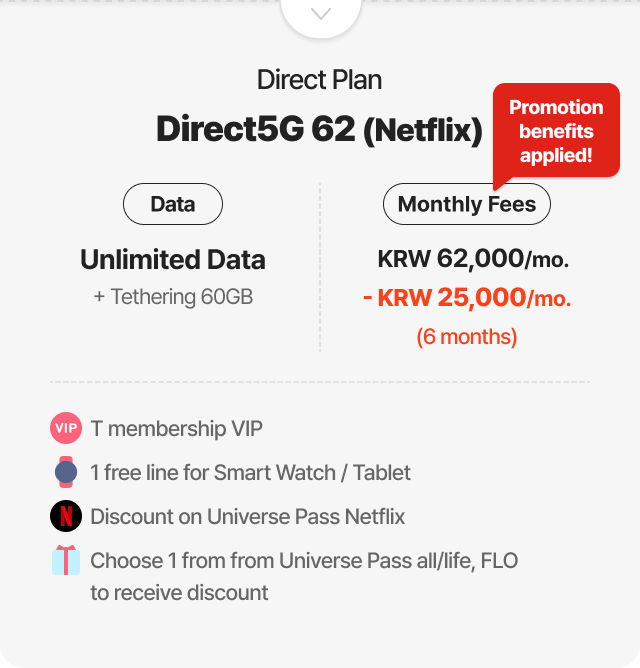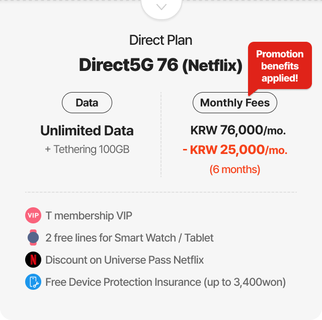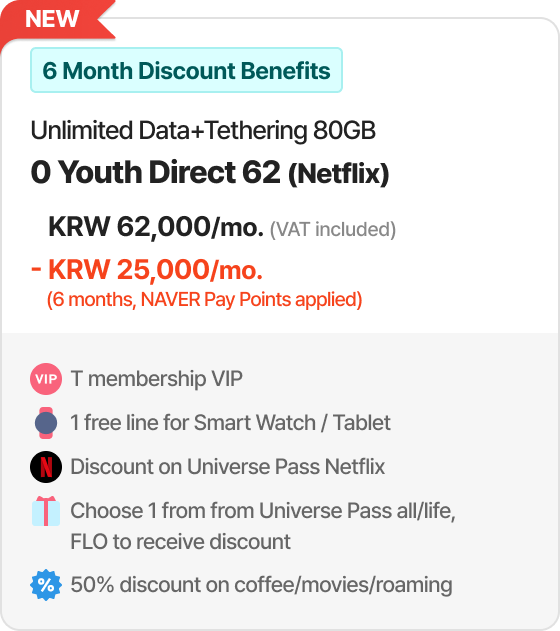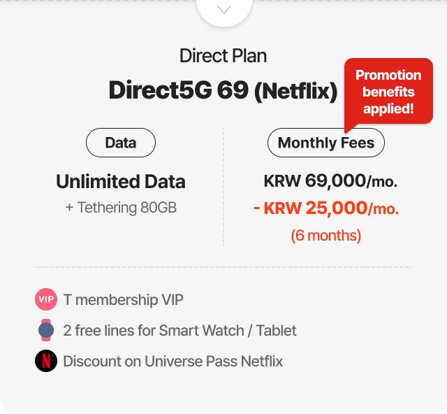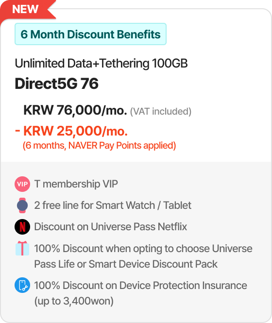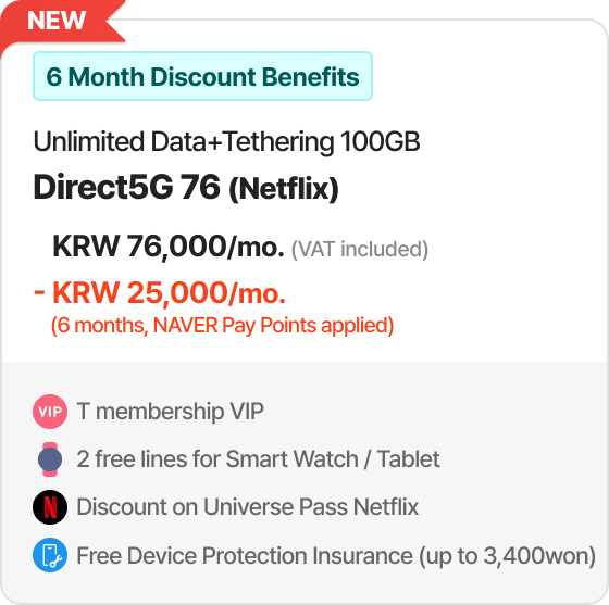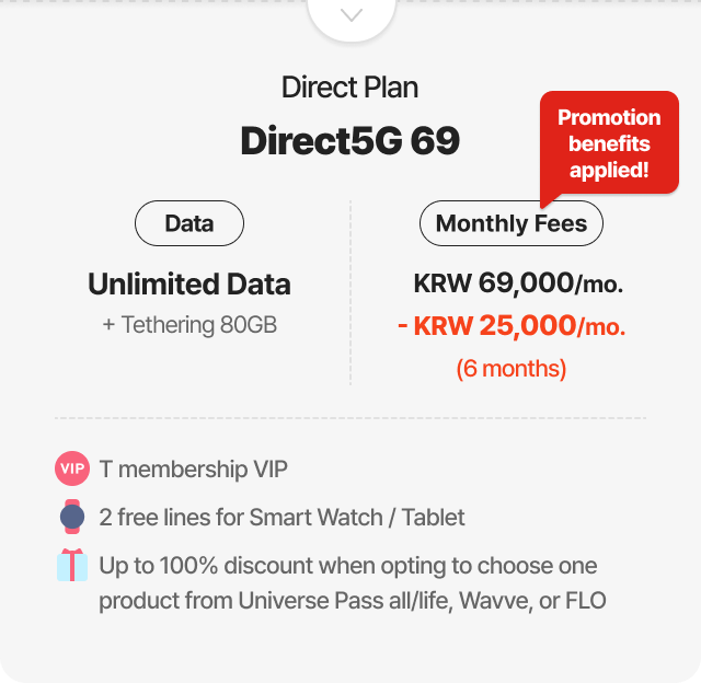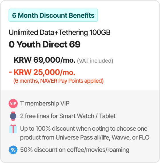 Example of 30% discount for online plan(T Family Discount for Total mobile phone subscription years of family members + Internet subscription years of 30 years or more) 6GB + Max. 400kbps | Direct5G 27 | Monthly Fees KRW 27,000/mo. > KRW 18,900/mo. [30% discount]