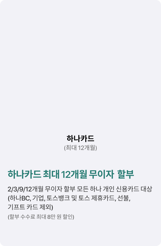 2/3/9/12개월 무이자 할부 모든 하나 개인 신용카드 대상(하나BC, 기업, 토스뱅크 및 토스 제휴카드, 선불, 기프트 카드 제외)