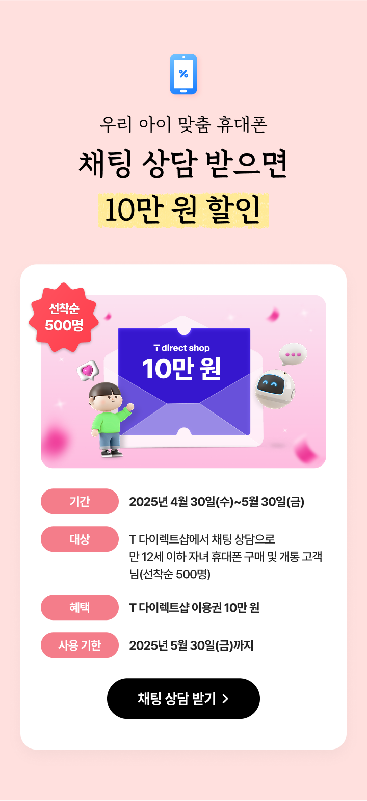 T 다이렉트샵에서 채팅 상담으로 만 12세 이하 자녀 휴대폰 구매 및 개통 고객님(선착순 500명)