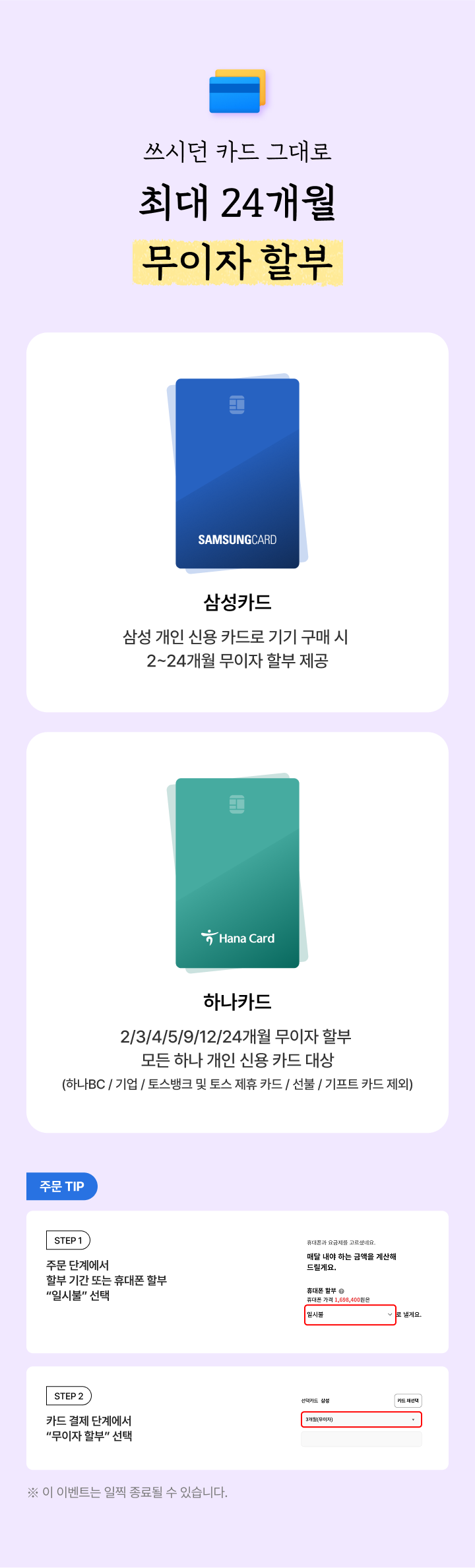 삼성 개인 신용 카드로 기기 구매 시 2~24개월 무이자 할부 제공