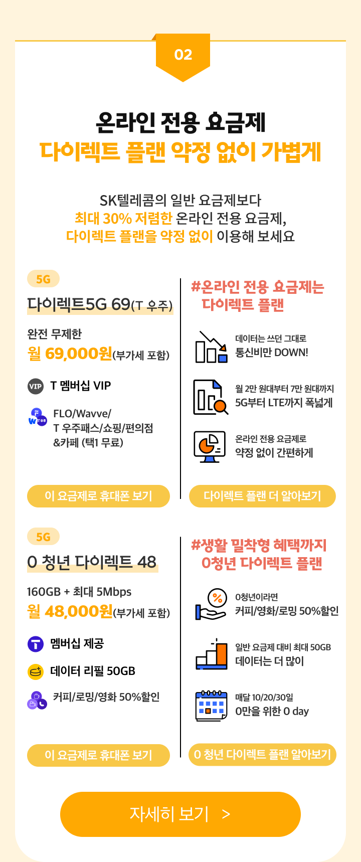 SK텔레콤의 일반 요금제보다 최대 30% 저렴한 온라인 전용 요금제, 다이렉트 플랜을 약정 없이 이용해 보세요