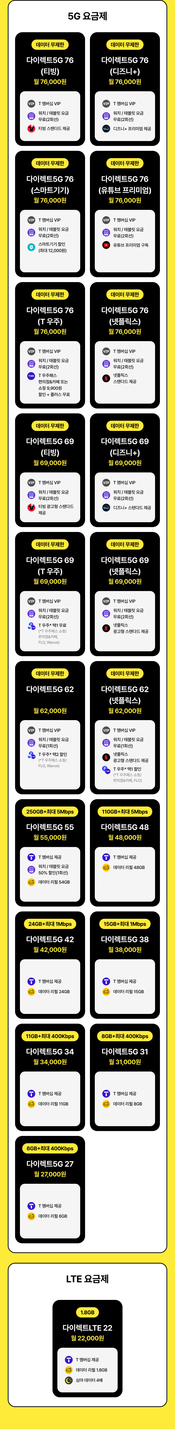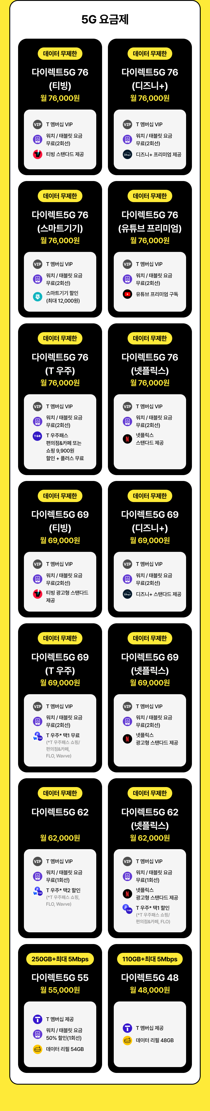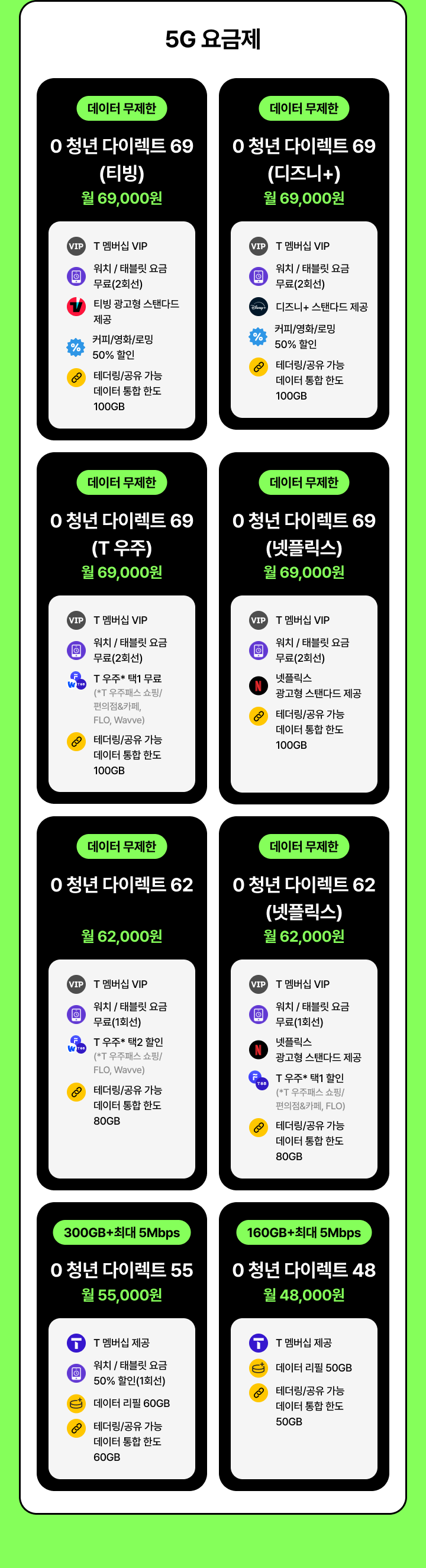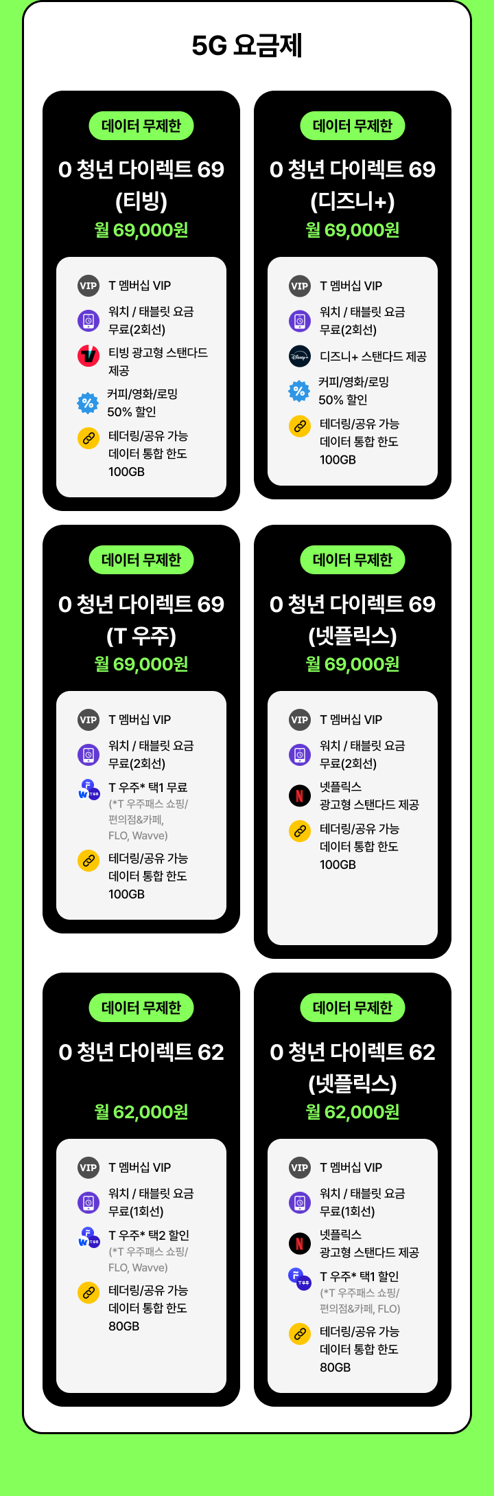 [데이터 무제한] 0 청년 다이렉트 62(넷플릭스) | 월 62,000원 | T 멤버십 VIP | 워치 / 태블릿 요금 무료(1회선) | 넷플릭스 광고형 스탠다드 제공 | T 우주* 택1 할인(*T 우주패스 쇼핑/편의점&카페, FLO) | 테더링/공유 기능 데이터 통합 한도 80GB