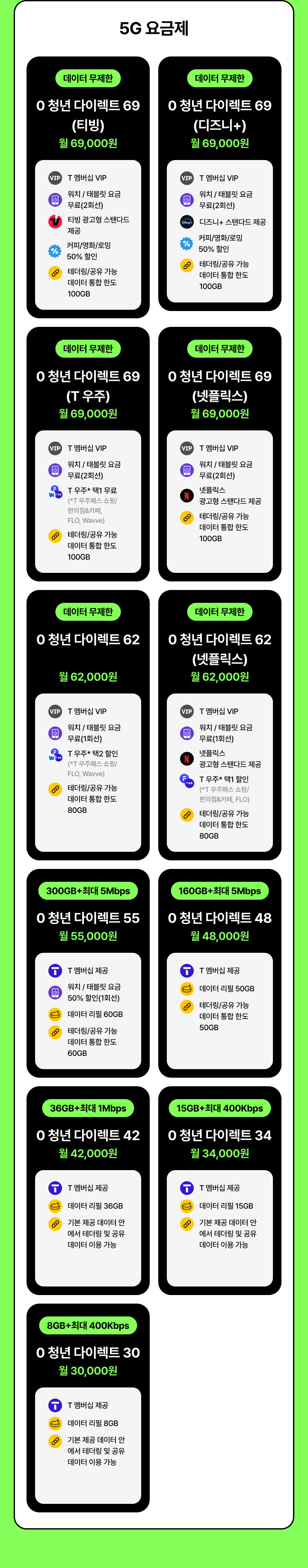 [데이터 무제한] 0 청년 다이렉트 69(티빙) | 월 69,000원 | T 멤버십 VIP | 워치 / 태블릿 요금 무료(2회선) | 티빙 광고형 스탠다드 제공 | 커피/영화/로밍 50% 할인 | 테더링/공유 기능 데이터 통합 한도 100GB