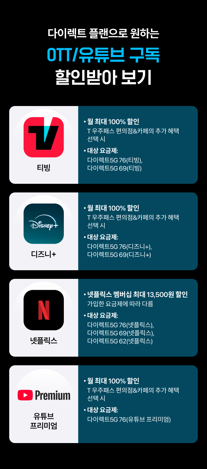 대상 요금제: 다이렉트5G 76(티빙), 다이렉트5G 69(티빙)