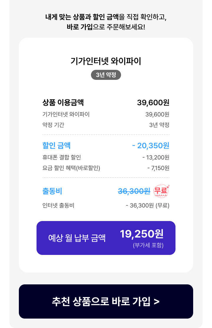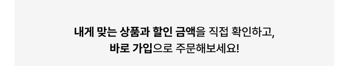 내게 맞는 상품과 할인 금액을 직접 확인하고, 바로 가입으로 주문해보세요!