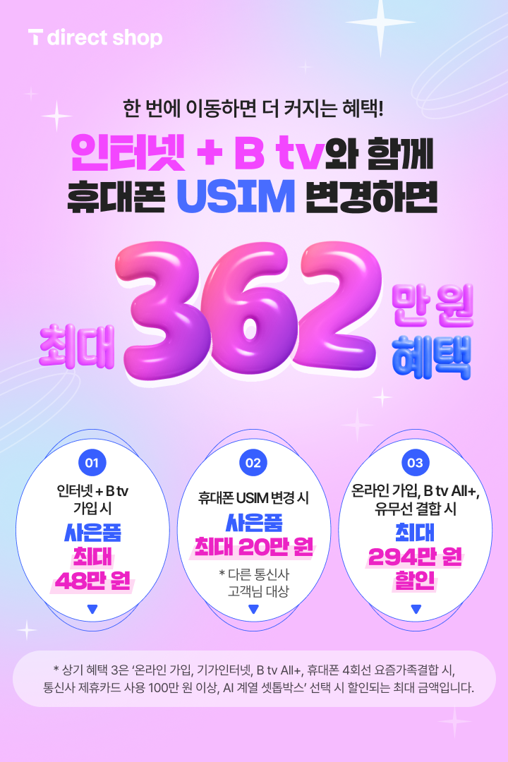 * 상기 혜택 3은 ‘온라인 가입, 기가인터넷, B tv All+, 휴대폰 4회선 요즘가족결합 시, 통신사 제휴카드 사용 100만 원 이상, AI 계열 셋톱박스’ 선택 시 할인되는 최대 금액입니다.