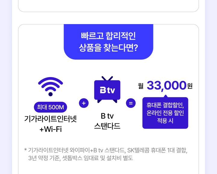 {최대 500M 기가라이트인터넷+Wi-Fi} + {B tv 스탠다드} = 월 33,000원(휴대폰 결합할인, 온라인 전용 할인 적용 시)
