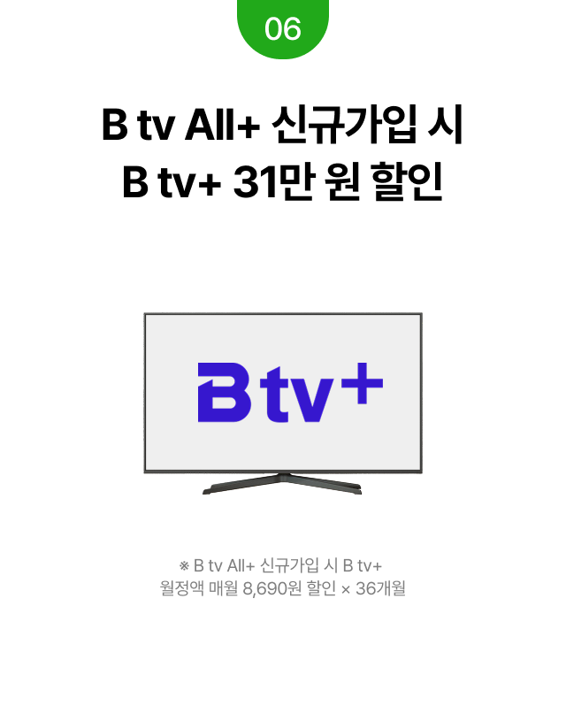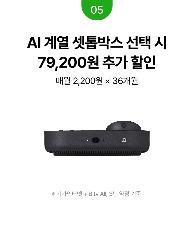* 상기 혜택 3은 ‘온라인 가입, 기가인터넷, B tv All+, 휴대폰 4회선 요즘가족결합 시, 통신사 제휴카드 사용 100만 원 이상, AI 계열 셋톱박스’ 선택 시 할인되는 최대 금액입니다.