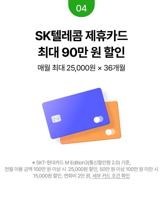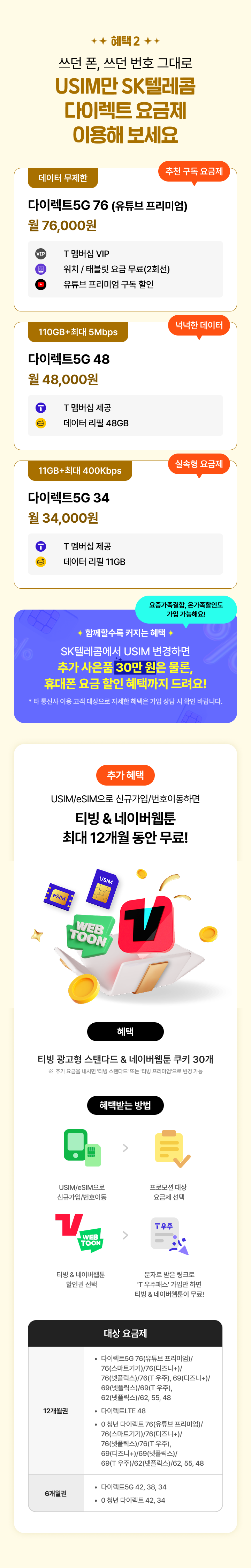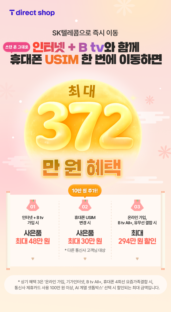 함께할수록 커지는 혜택 | SK텔레콤에서 USIM 변경하면 추가 사은품 30만 원은 물론, 휴대폰 요금 할인 혜택까지 드려요! * 타 통신사 이용 고객 대상으로 자세한 혜택은 가입 상담 시 확인 바랍니다.
