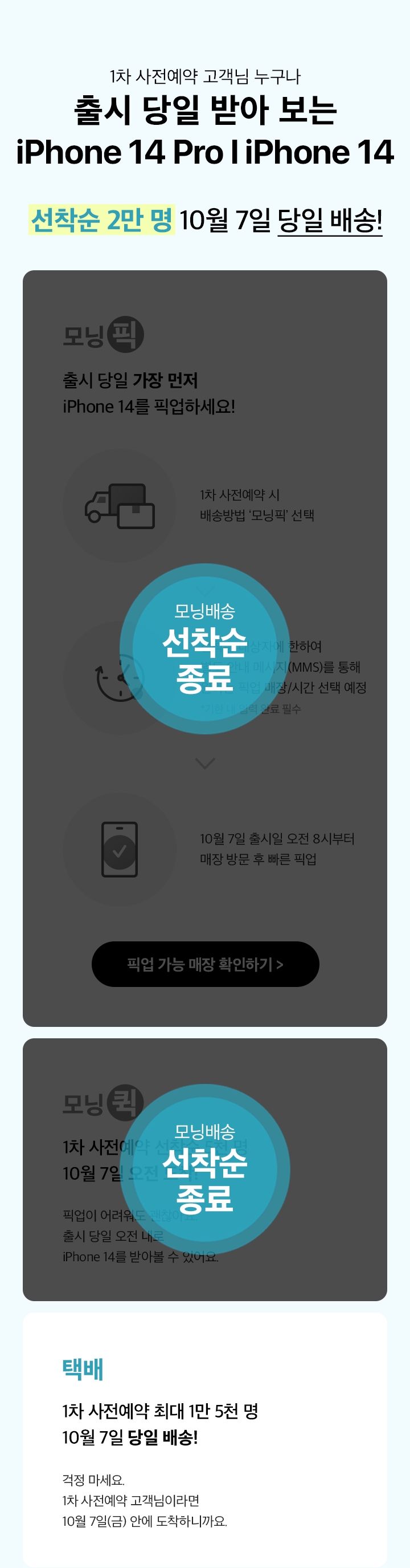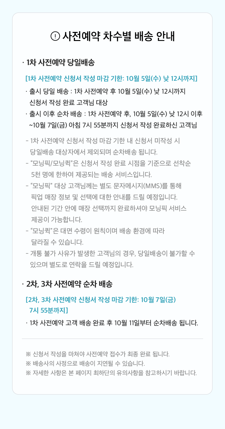 [택배] 1차 사전예약 최대 1만 5천 명 10월 7일 당일 배송! 걱정마세요. 1차 사전예약 고객님이라면 10월7일(금) 안에 도착하니까요.