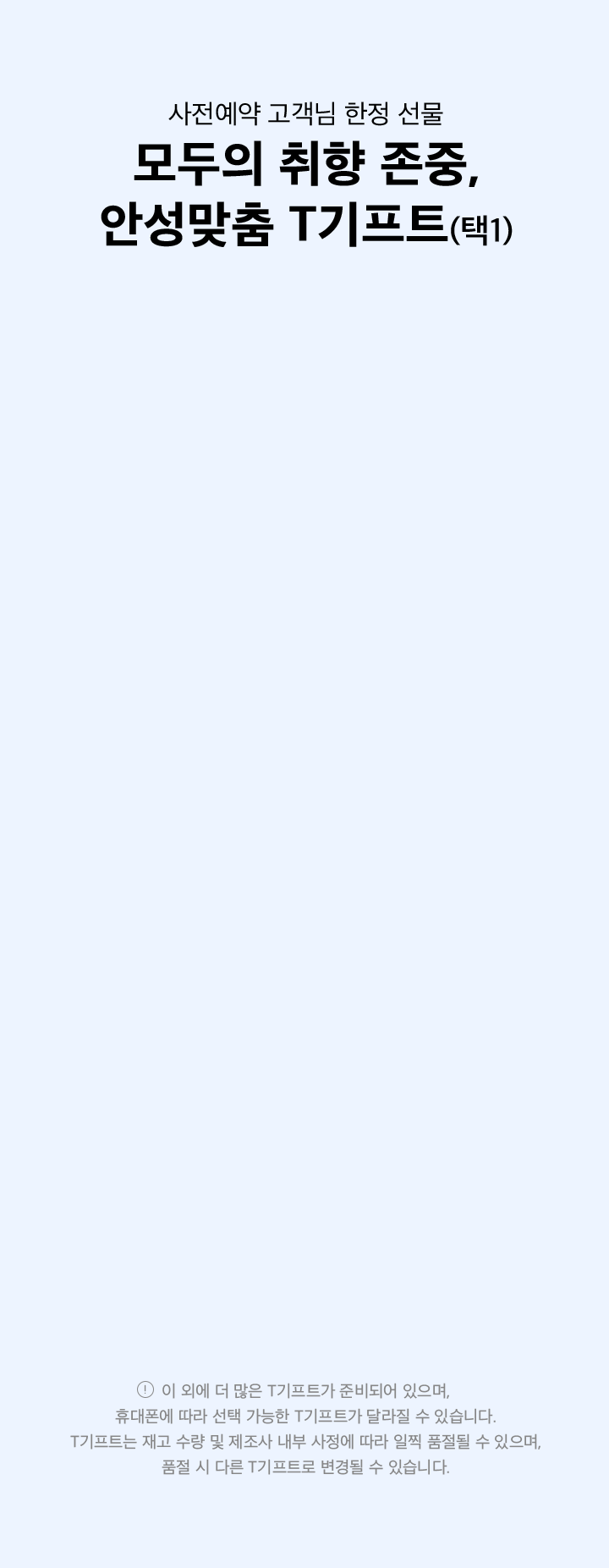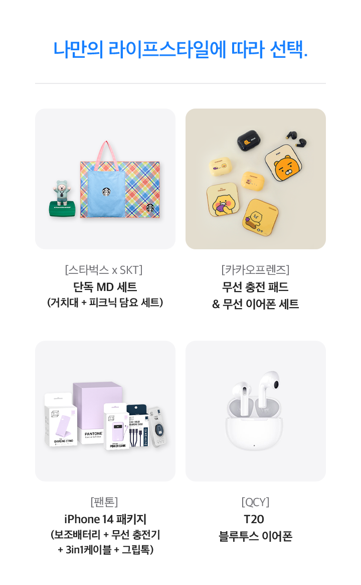 이 외에 더 많은 T기프트가 준비되어 있으며, 휴대폰에 따라 선택 가능한 T기프트가 달라질 수 있습니다. T기프트는 재고 수량 및 제조사 내부 사정에 따라 일찍 품절될 수 있으며, 품절 시 다른 T기프트로 변경될 수 있습니다.