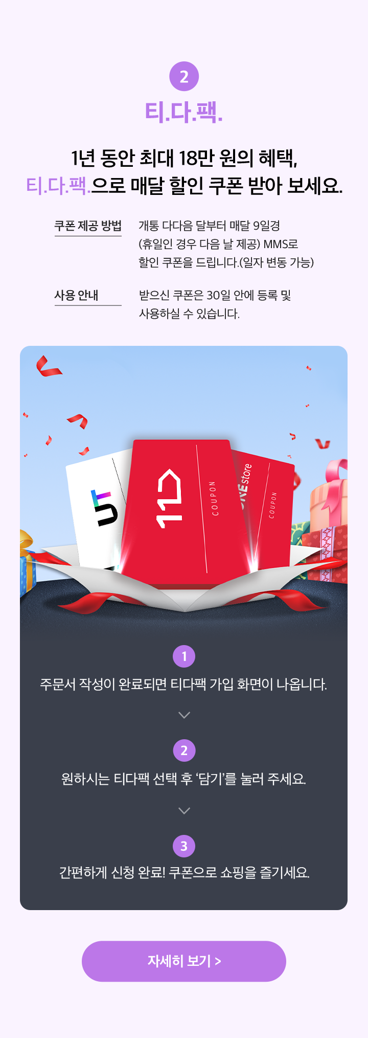 1년 동안 최대 18만 원의 혜택, 티.다.팩.으로 매달 할인 쿠폰 받아 보세요.