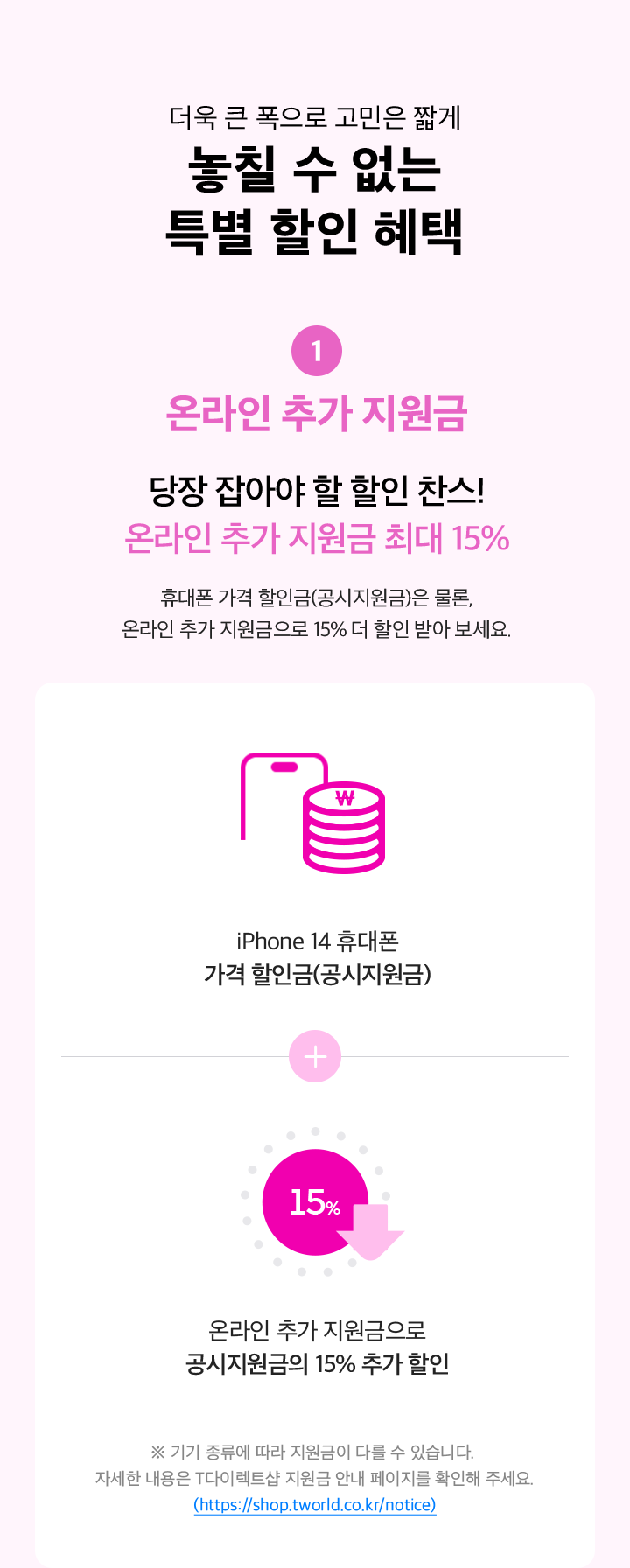 휴대폰 가격 할인금(공시지원금)은 물론, 온라인 추가 지원금으로 15% 더 할인 받아 보세요.