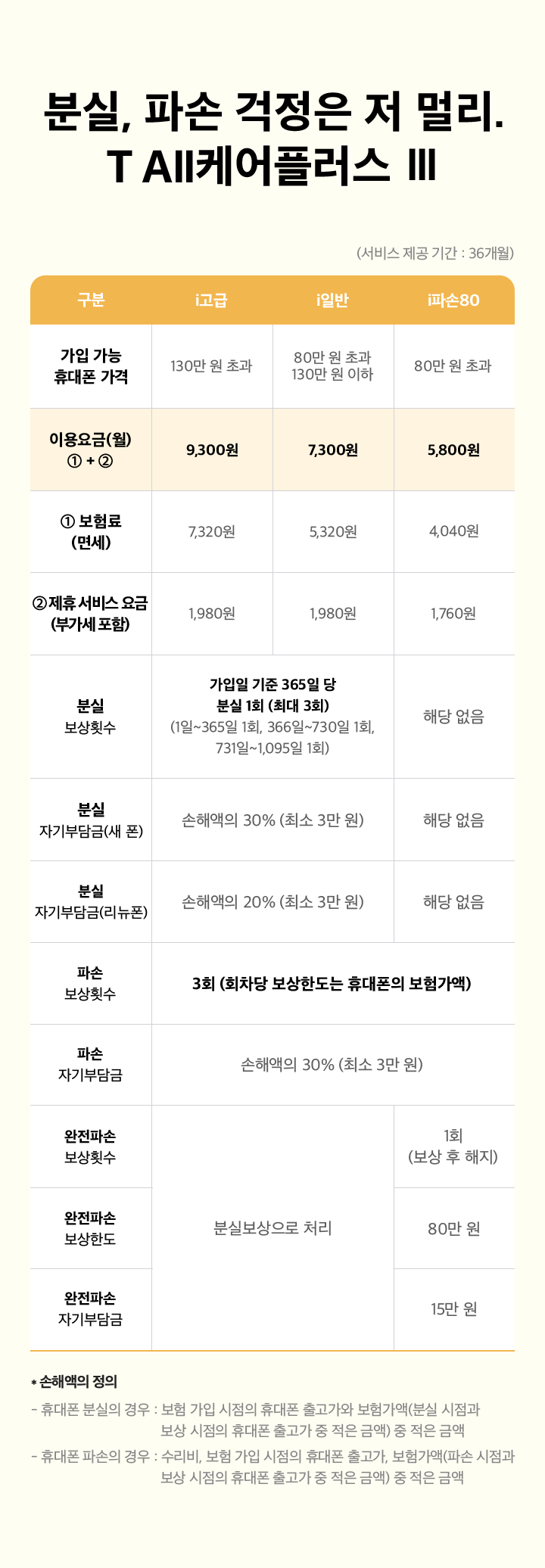 | 파손 | 보상횟수 | 3회(회차당 보상한도는 휴대폰의 보험가액) | ||