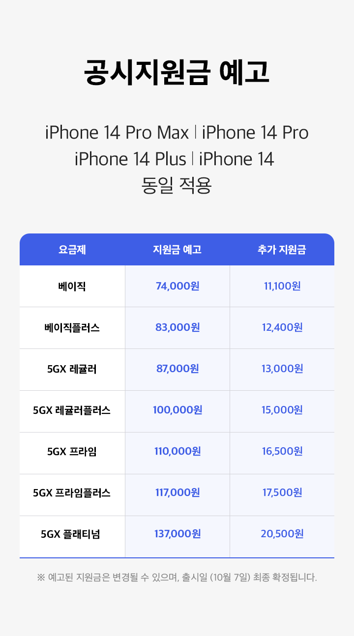 | 요금제 | 지원금 예고 | 추가 지원금 |
